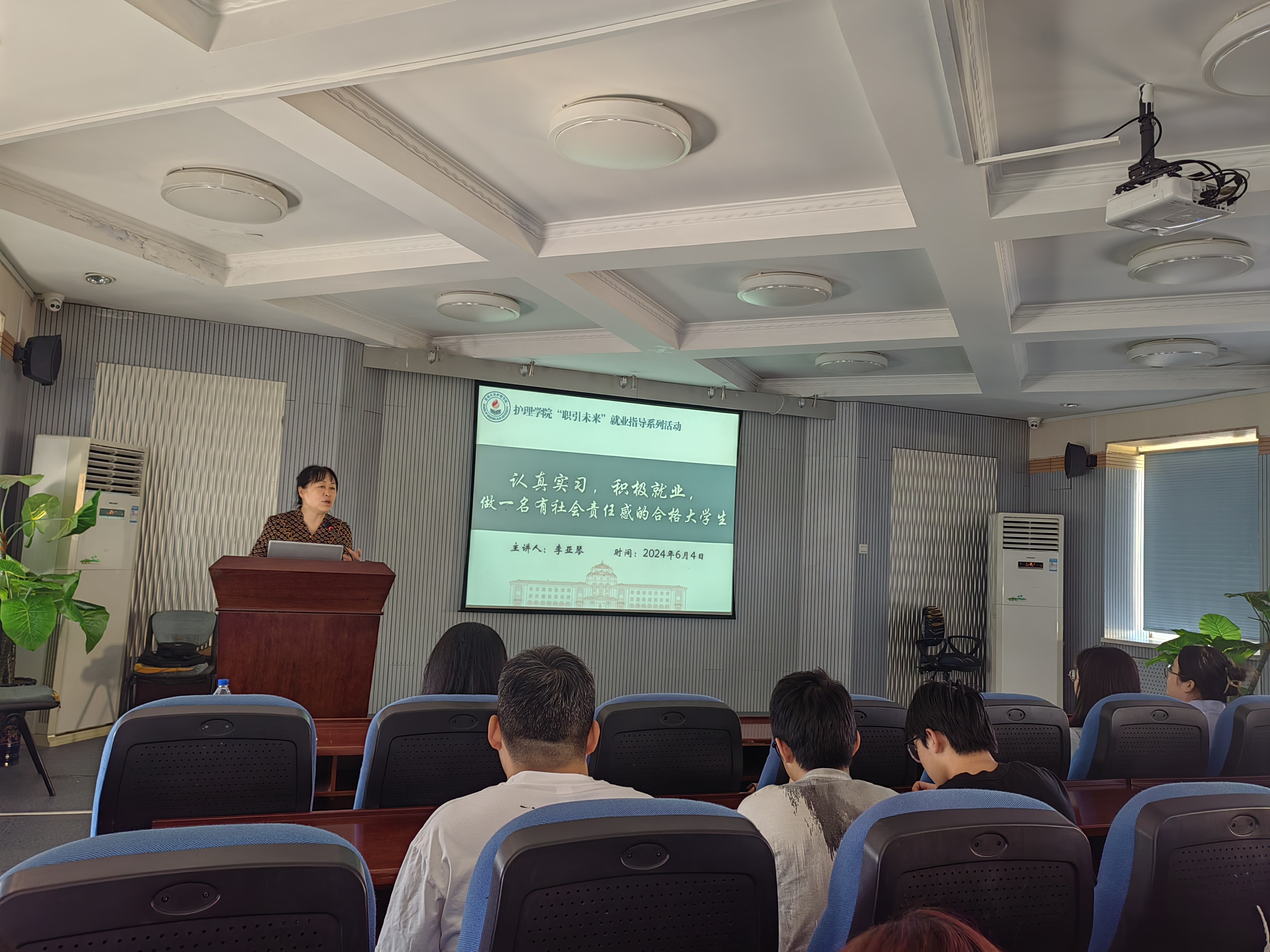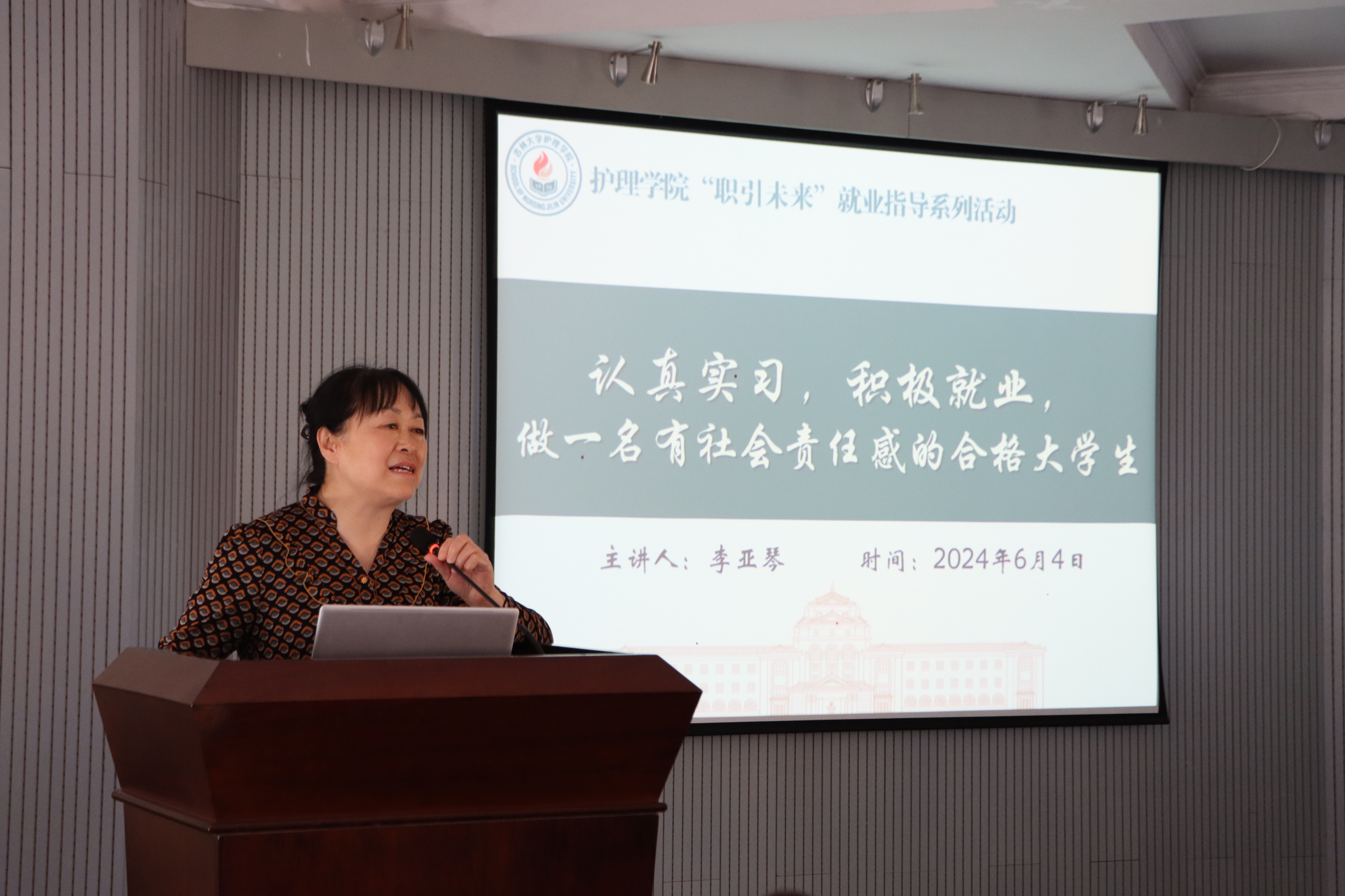 为强化学生职业认知和认同,引导学生合理规划未来职业方向,提升学生就业能力,2024年6月4日,护理学院邀请新民校区关工委驻会委员李亚琴老师为学生做就业指导专题讲座。护理学院党委副书记兼副院长葛宗梅、学生工作办公室主任刘宇飞,以及2021级、2022级全体学生参加讲座。
